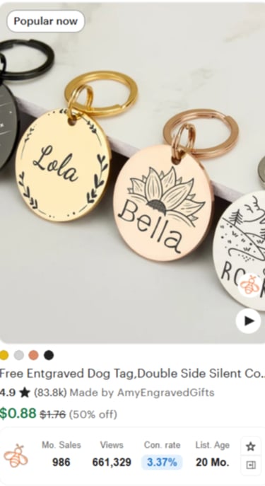 AmyEngravedGifts sells engraved tags for $0.88 and does 986+ monthly sales with a 3.37% conversion rate.